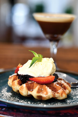To finish off our meal, we tried the scrumptious Belgian Waffles with berry compote and lemon curd, and a Tiramisu Cocktail – a bit like an espresso martini on steroids, but made with dark rum instead of vodka, Frangelico and fresh coffee.