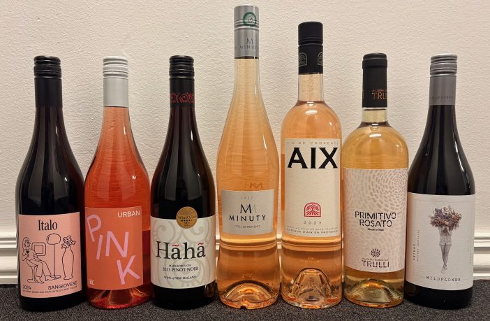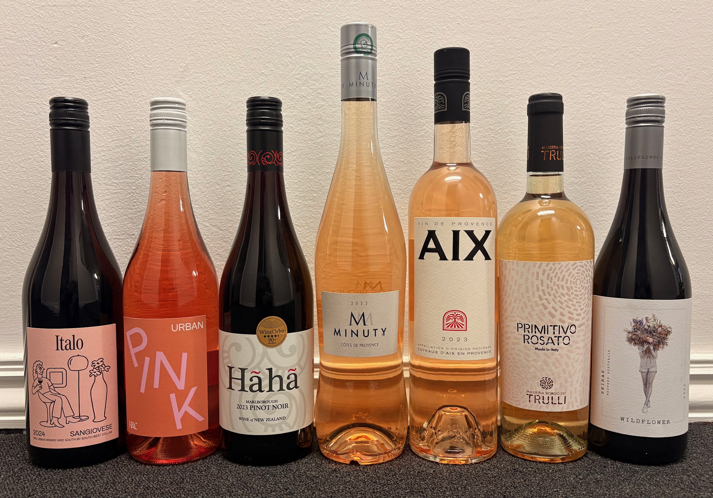2024 Italo Sangiovese at H&C Urban Winery, Urban Pink at H&C Urban Winery, 2023 Ha Ha Pinot Noir at The Alcove, 2023 Minuty Rose at The Alcove, 2023 AIX Rose at Little Wave, 2022 Primitivo Rosato at The Vault Restaurant and 2022 Wildlower Shiraz at U&I Cafe.